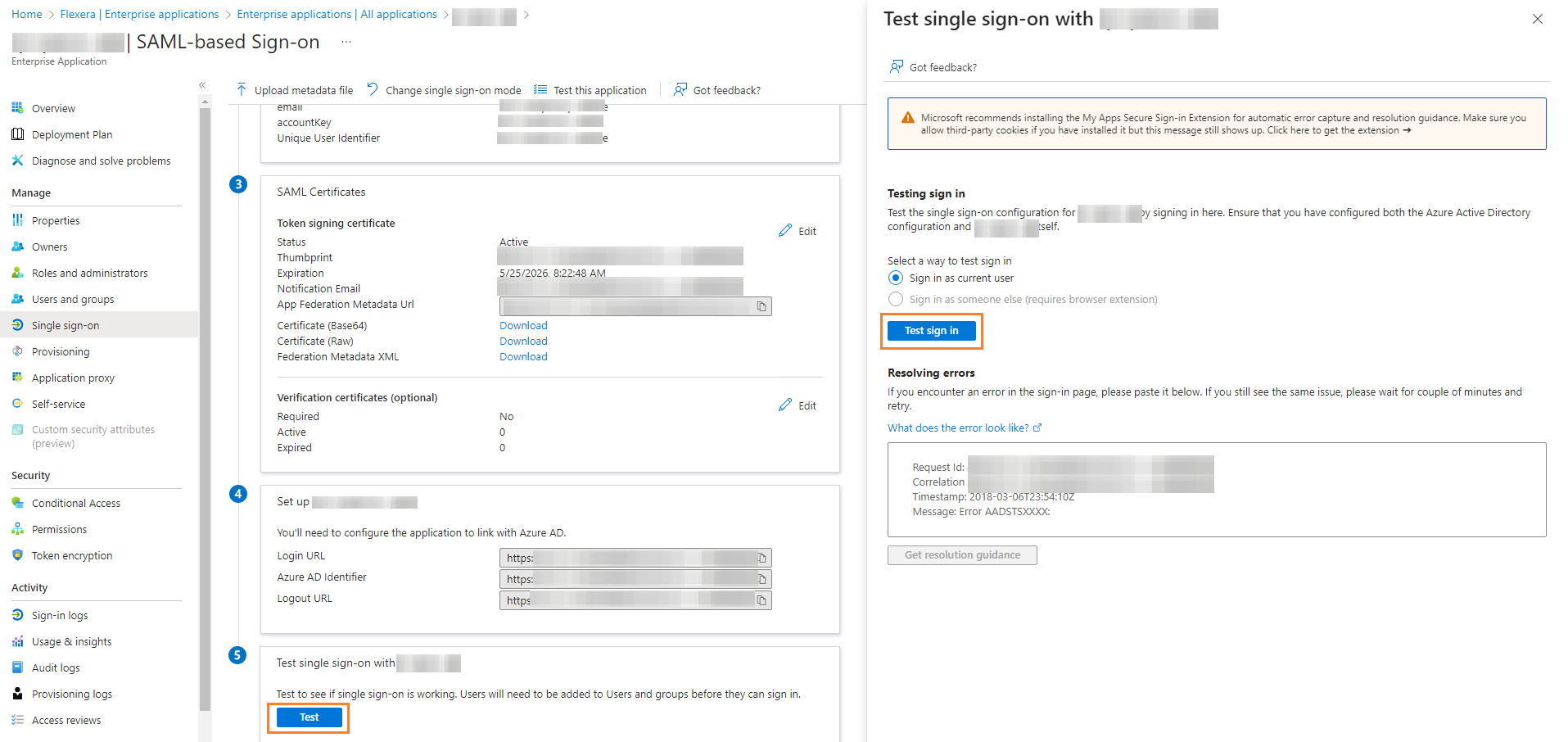 Click Test. The Test single sign-on appears on the right side. Click the Test Sign in button.