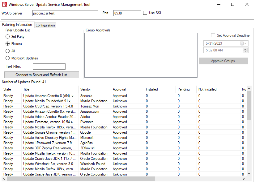 noteIf you select the Flexera filter option and click the Connect to Server and Refresh List button, you will see the list of patches published to the WSUS from the SVM Patch Publisher/SVM console.