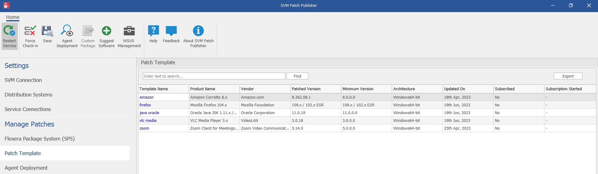 The Patch Template view displays the SPS patches that are saved as Patch Templates. This view also enables you to edit and publish templates to one of the configured endpoint management systems.