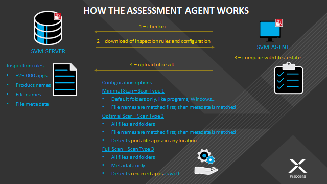 The graphic below summarizes how the Software Vulnerability Manager Agent works and compares the three Scan Types.