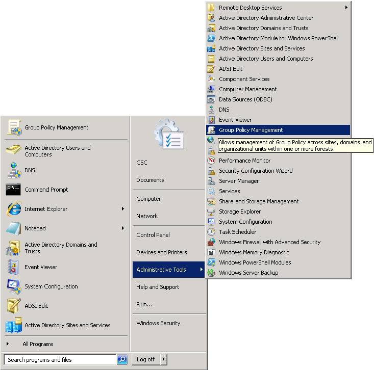 2. On the Domain Controller, click Start > Administrative Tools > Group Policy Management. Right-click your Domain name and select Create a GPO in this domain and Link it here. Alternatively, you can edit an existing GPO.