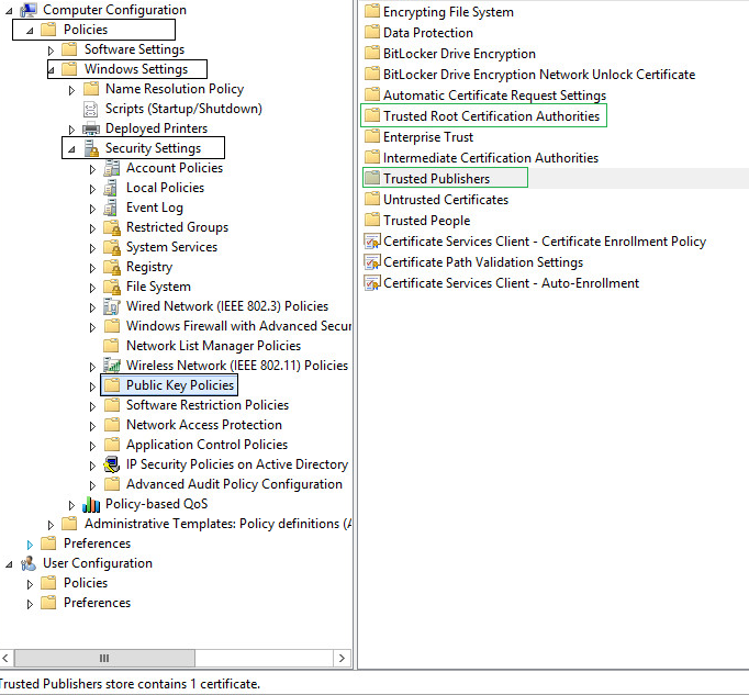 4. Navigate to Computer Configuration > Policies > Windows Settings > Security Settings > Public Key Policies.