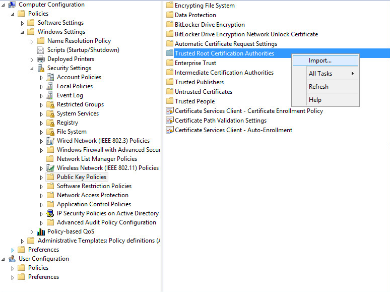 5. Right-click Trusted Root Certification Authority and select Import. Import the certificate that you exported in Step 1.