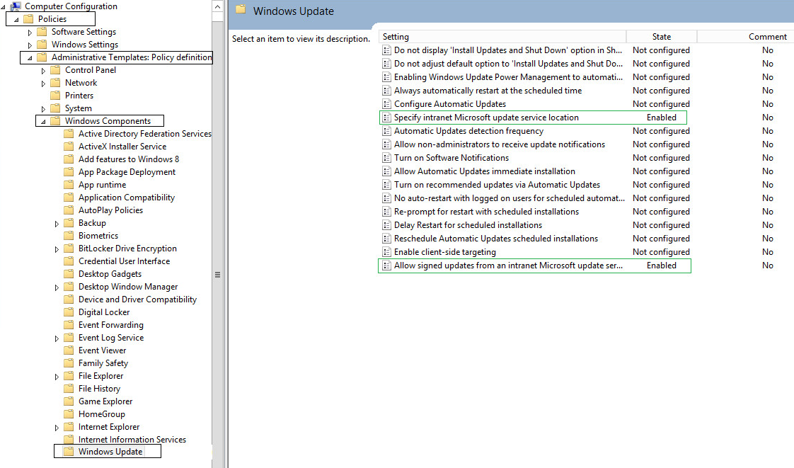 The clients affected by the created GPO will install the certificate being distributed (either the WSUS Self-Signed Certificate or your own CA certificate) and acknowledge the Windows Update settings that you have specified in the GPO.