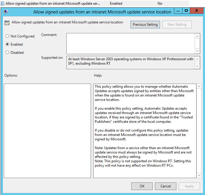 8. On the right-side menu, double-click Allow signed updates from an intranet Microsoft update service location . Select Enabled and click OK .