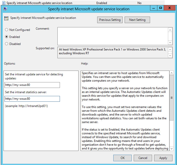 9. On the right-side menu, double-click Specify intranet Microsoft update service location. Enable this setting and modify the existing empty fields with the intranet address of your WSUS Server. This step is only valid for WSUS integration and is not required for System Center Configuration Manager integration.