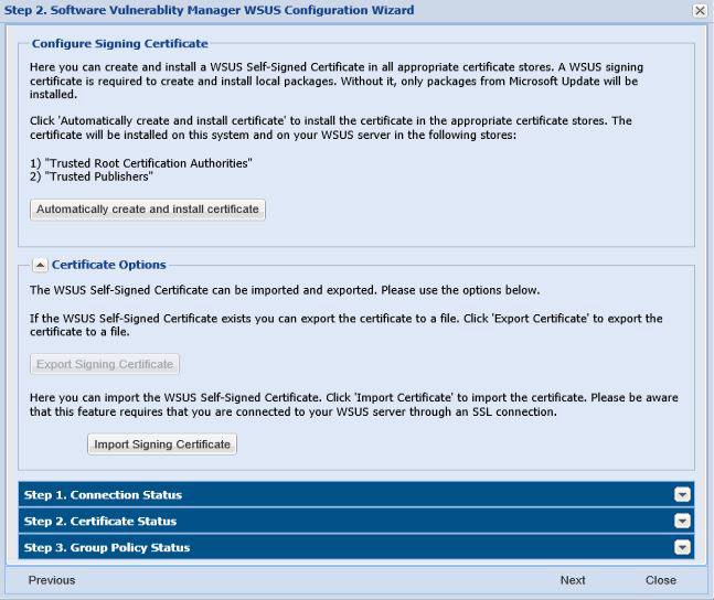 A code-signing certificate is needed to publish third-party updates to WSUS/System Center so they can be deployed as patches. In this Step Software Vulnerability Manager can request the WSUS to create and install the WSUS Self-Signed Certificate.