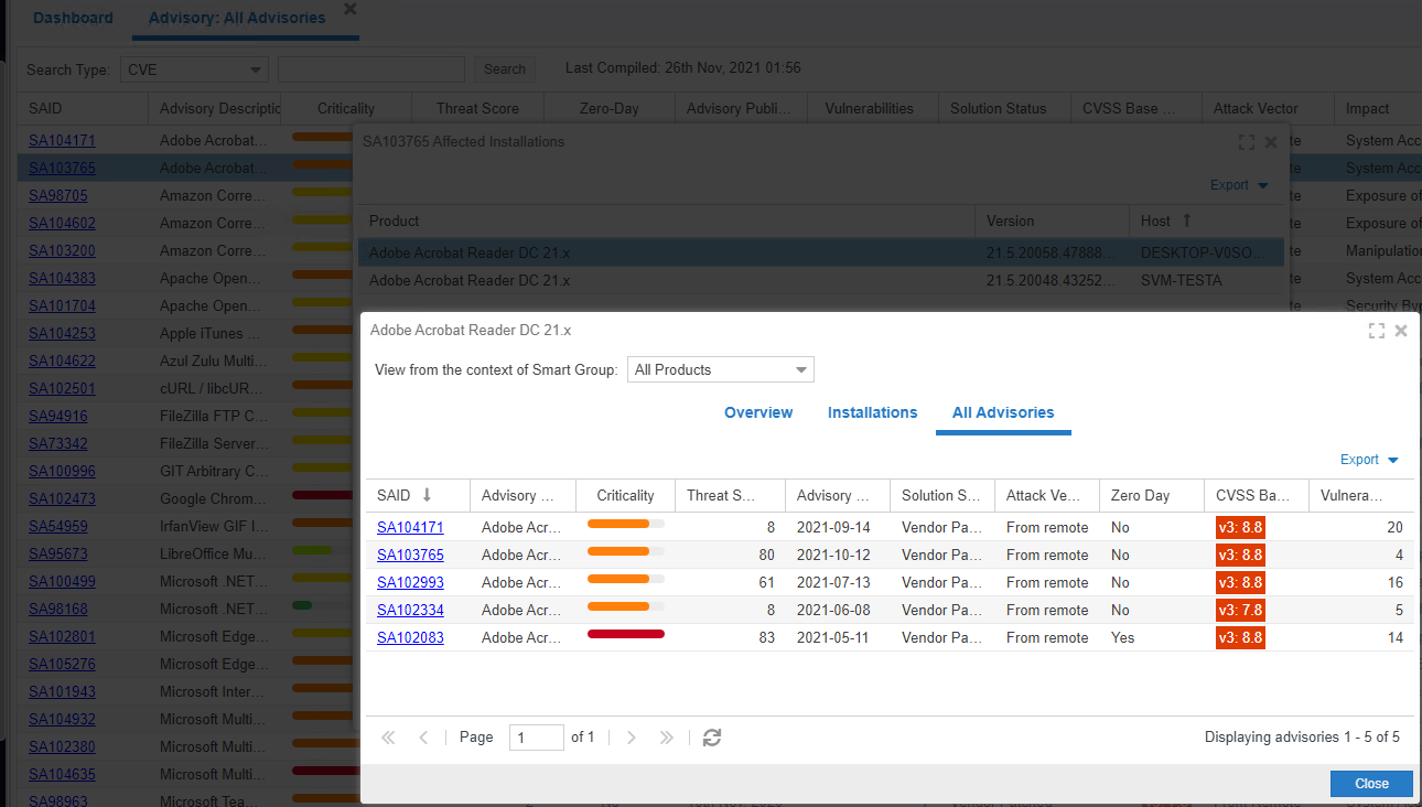 The All Advisories list affecting a product shows all current and past advisories that affect a product. Note that the Secunia Advisory ID number (SAID) listed under the SAID column could be related to different platforms.