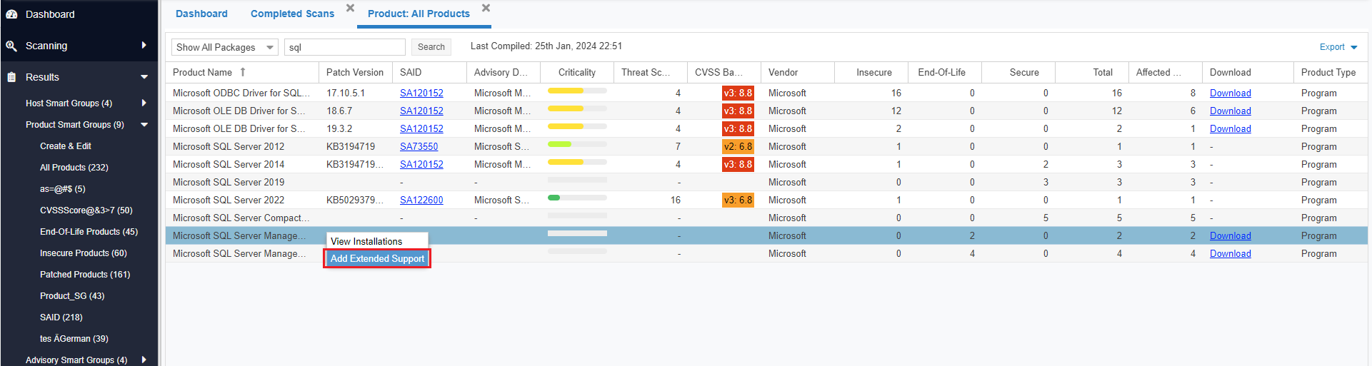 6. Extended support added for the selected product can be seen in the Scanning > Filter Scan Results> Extended Support .
